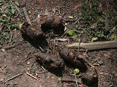 If you double-click on this pic, you can see that there is hair in the scat which would be from some mammal that the bear ate (maybe a squirrel). There are also some kind of fruit skins that I couldn't identify. Though they look a bit like plum skins, it is too early for wild plums (the wild fruit trees are just setting their blossoms). There are also several kinds of seeds in the scat.